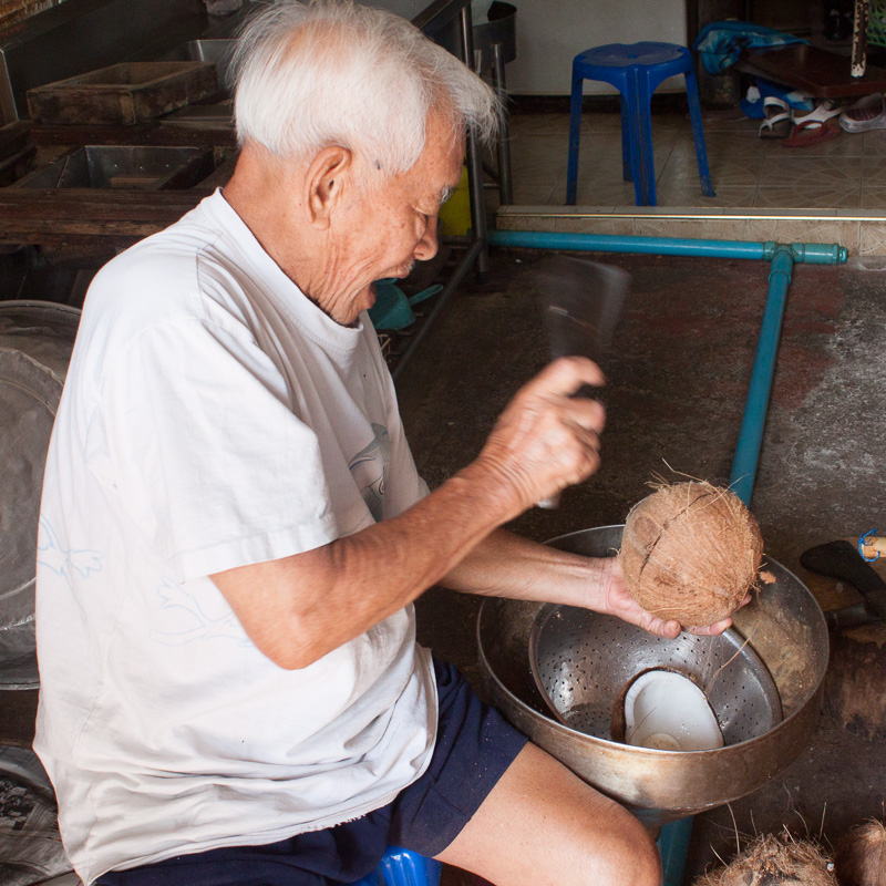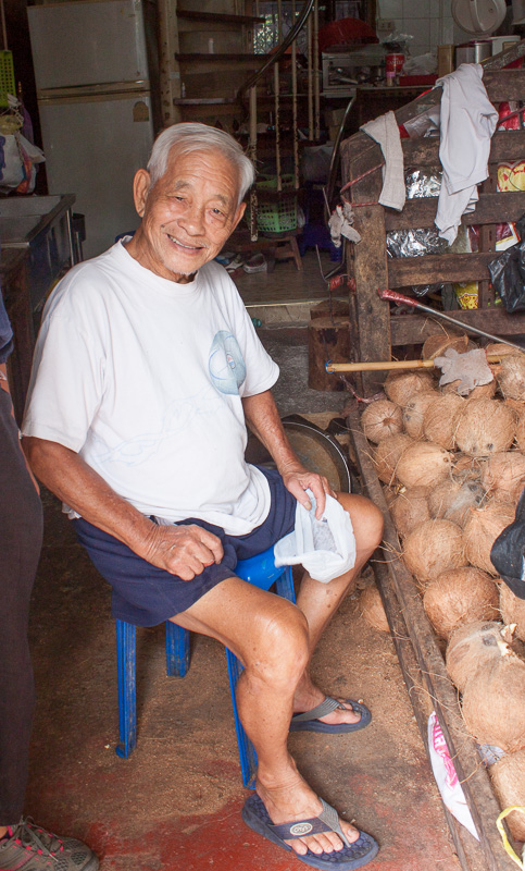The coconut man is a hoot. He’s 83 and attributes his good health to riding his bicycle, whacking coconuts open and only working 6 hours a day.  Here he demonstrates his coconut prowess in the shop he’s lived above all his life: