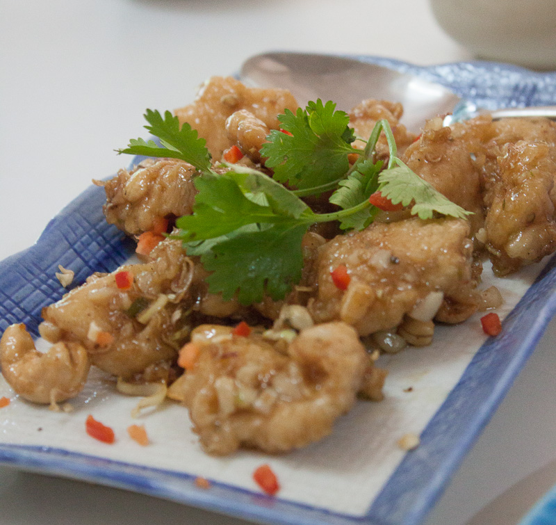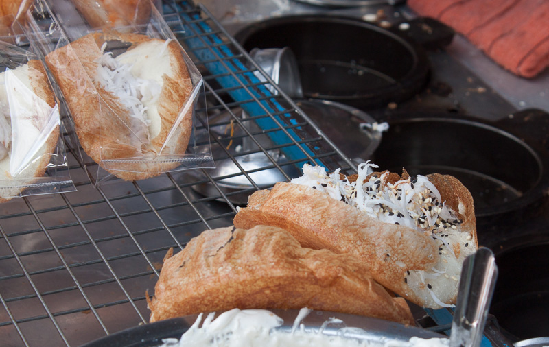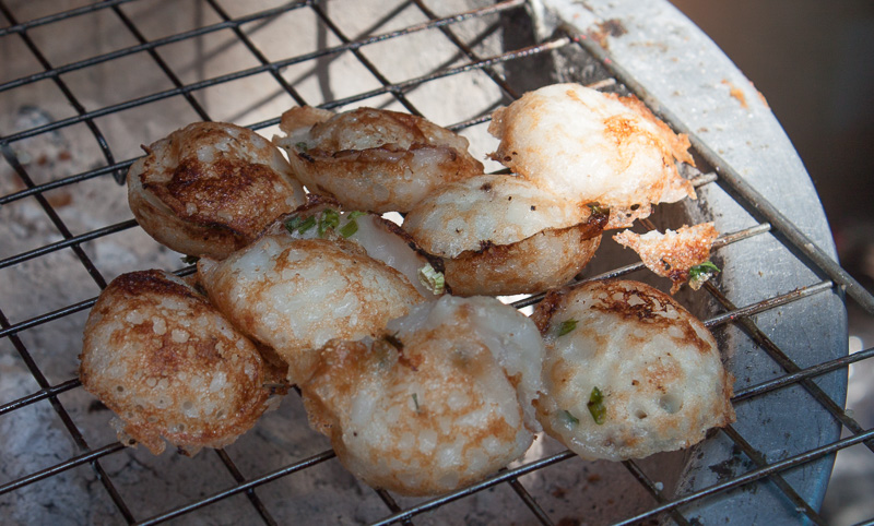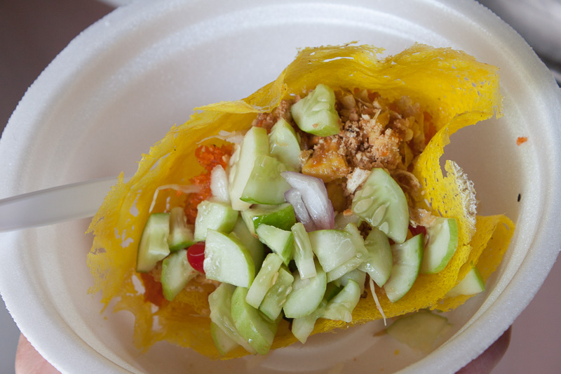 That paper-thin crispy yellow bit of heaven is what our guide, Chin, referred to as “Thai-style bánh xèo.”  Filled with an other-worldly combination of ground shrimp, coconut, thai pepper, cucumbers and topped with a sweet vinagrette.