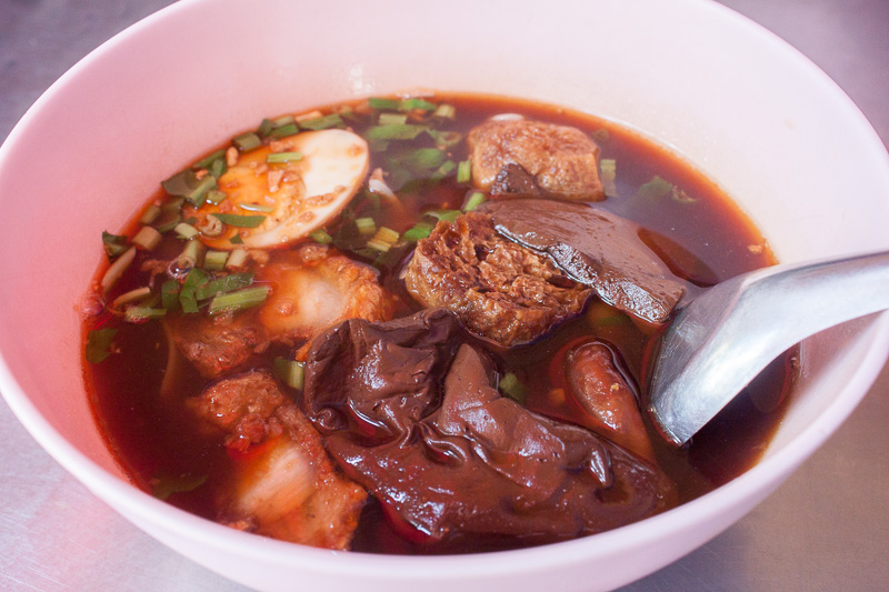 A spicy soup with fried tofu, blood sausage, pork cracklings and a boiled egg.