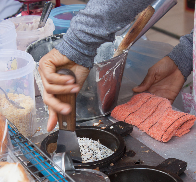 But first, she needs to put in some filling.  In this case, it is coconut with a mixture of white and black sesame seeds.