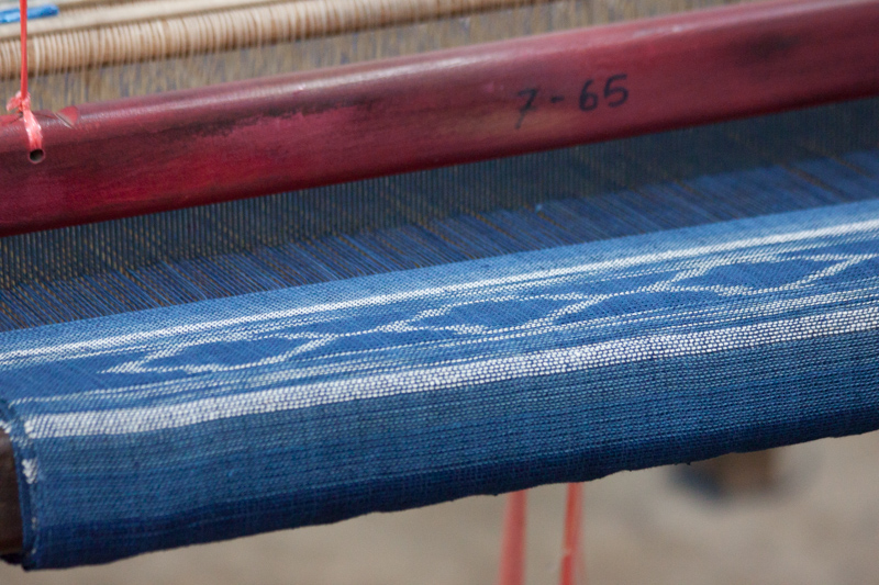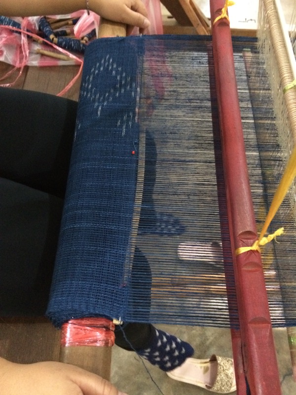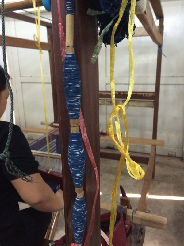 I didn’t see this part of ikat done; however, there is a nice picture of the weft frame and the process of wrapping the weft to resist dying in this class description for ikat weaving at Houey Hong: