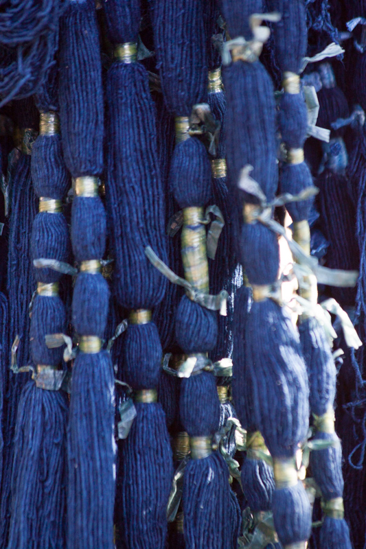 After being wrapped, the threads are taken off the frame in bundles and dyed in an indigo bath.