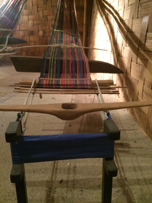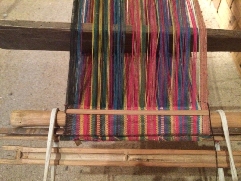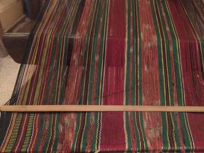 Here is a close-up of the fabric being woven. Note the pink and white ikat pattern: