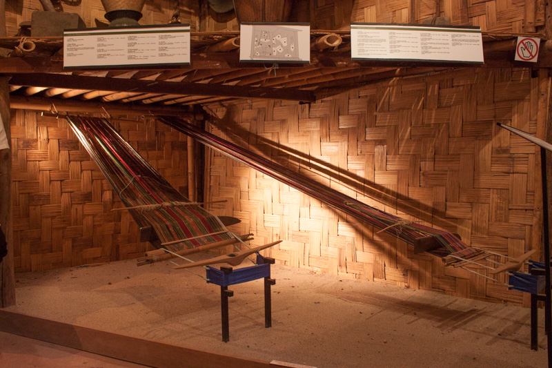 Kmhmu Kouene women in Phadeng village weave fabric for sin (Lao-style skirts) and shoulder bags on back strap looms. They use a loom with a wider cloth beam to create skirt material decorated with ikat technique or matmii (a type of resist dyeing), which forms the pink and white pattern. A weaver can weave about 1 to 1.5 metres in one day.