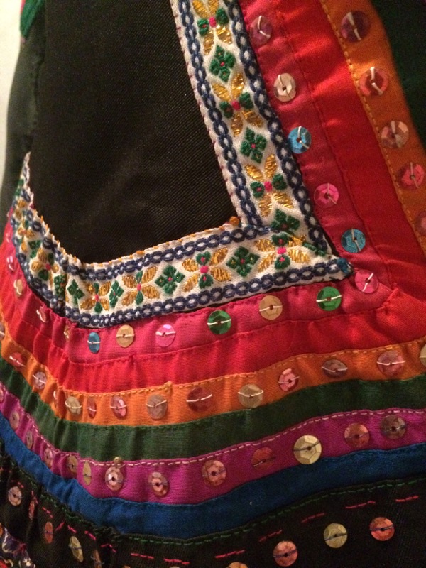 Factory-made appliqued cotton shirt with sequins and ribbon. Handwoven ikat cloth and factory-made cloth skirt. All hand sewn.