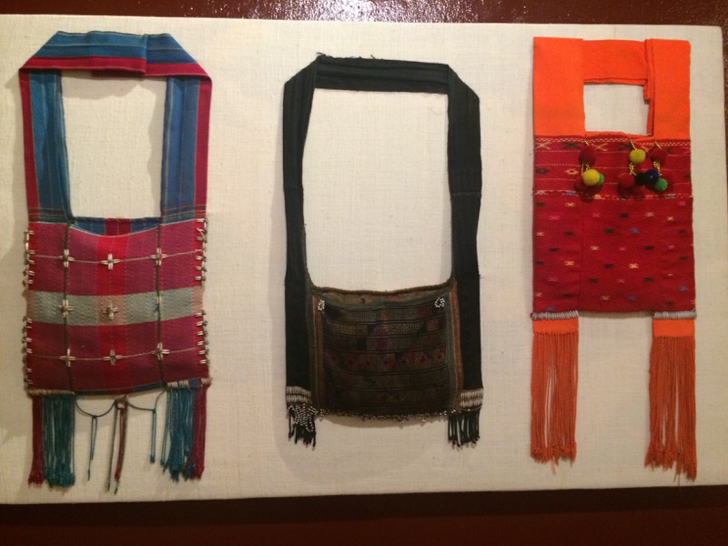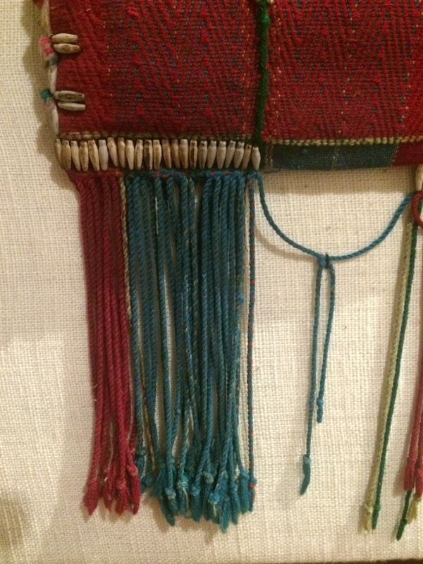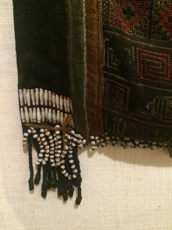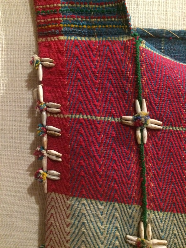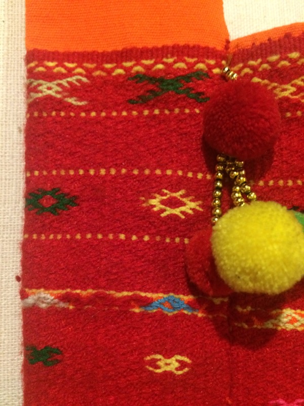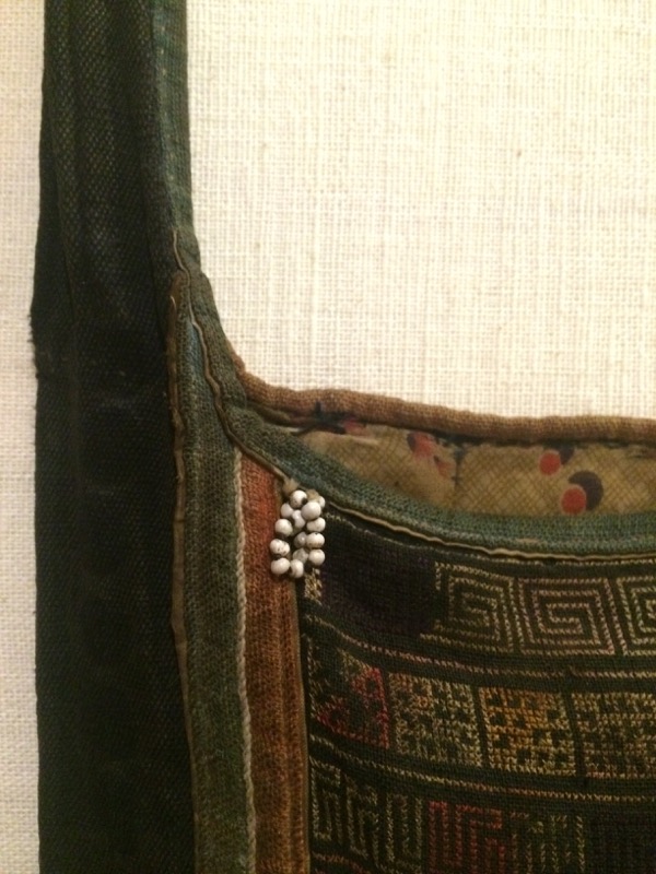 Stitched with white colored tube-shaped seeds on the bottom corners.