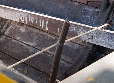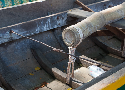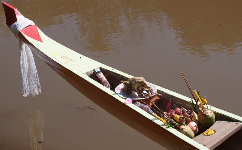 Regardless of the water-worthiness, or maybe because of it, all boats have some kind of ceremonial offering on the prow. This one took our prize for “Most edible offering”: