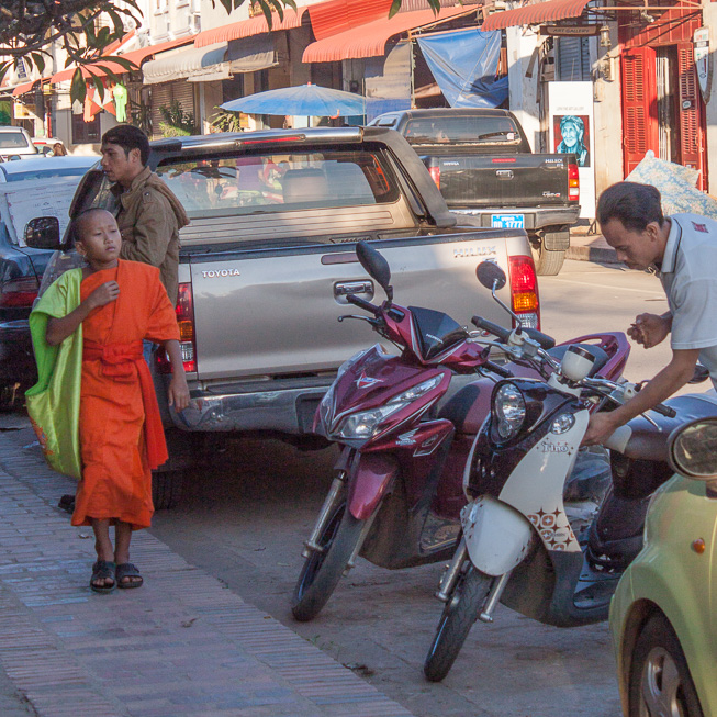 There is a large number of young monks walking around Luang Prabang. Here is a particularly serious looking one at late afternoon on Kingkitsarath Rd: