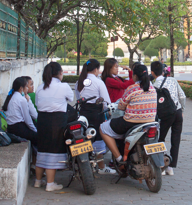 Schoolchildren everywhere like to hang out. These are outside the Lycée de Vientiane at 5PM. Those who are prone to holding forth may have held forth.
