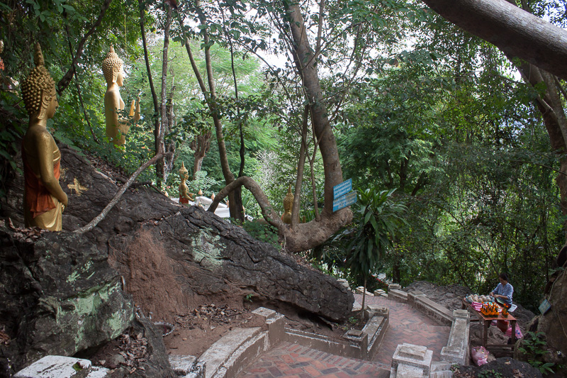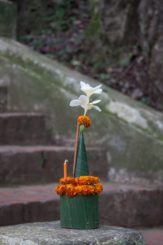 These are made of banana leaves and decorated with marigolds, and sometimes also orchids, candles and incense sticks. This vendor has a prime shady spot to make and sell these, right on the grounds of Mount Phousi: