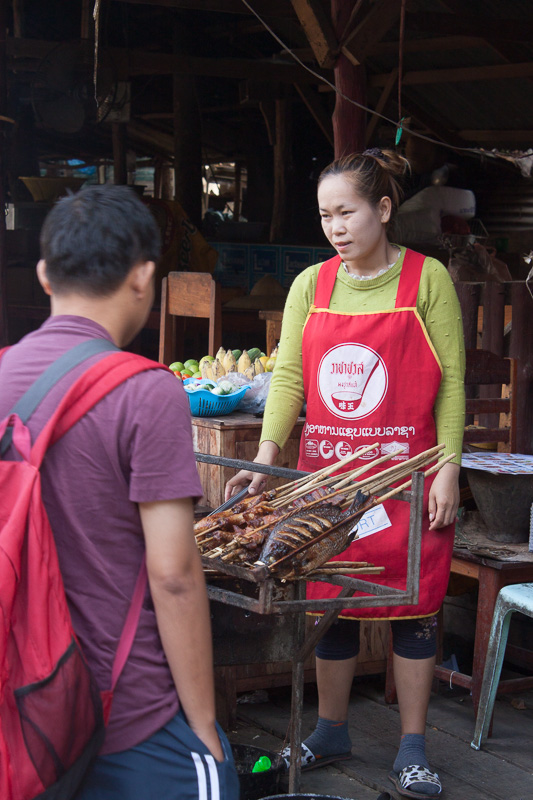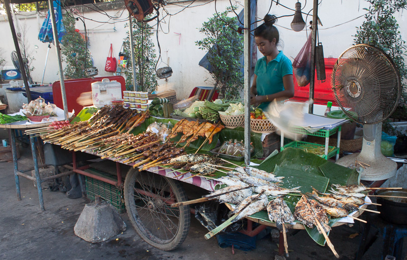 Street food is everywhere. This one is at the entrance to the Kuang Si waterfalls. Note the industrial-strength skewers: