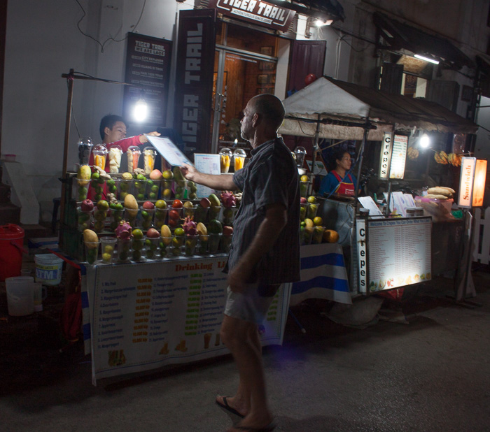 Food and drinks of all kinds are available. Fruit shakes are a common offering. Fresh fruits and ice, no dairy.