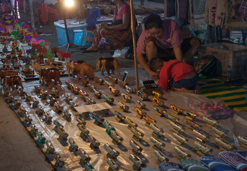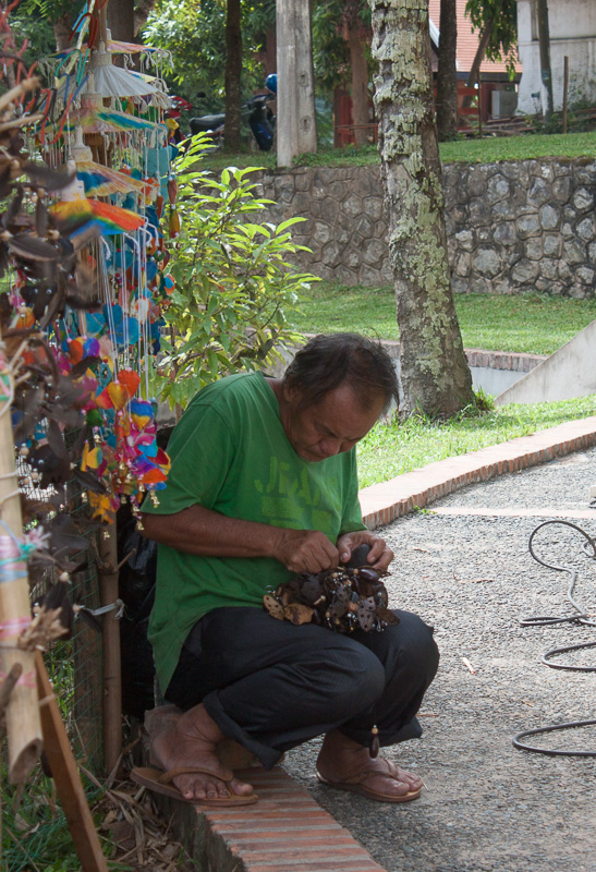 Other tourist trinkets involve a bit more skill. This man has a stand in the park at the tip of the Luang Prabang promontory. He sells winged decorations (butterflies and birds) carved out of coconut shells.