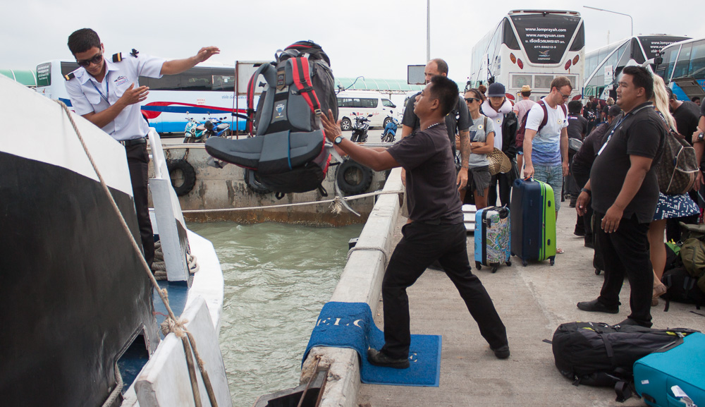 The Thais’ approach to commercial boating is, umm, somewhat casual. Here is how luggage is offloaded from the Lomprayah catamaran (Koh Samui to Phuket). More boating pictures are here.