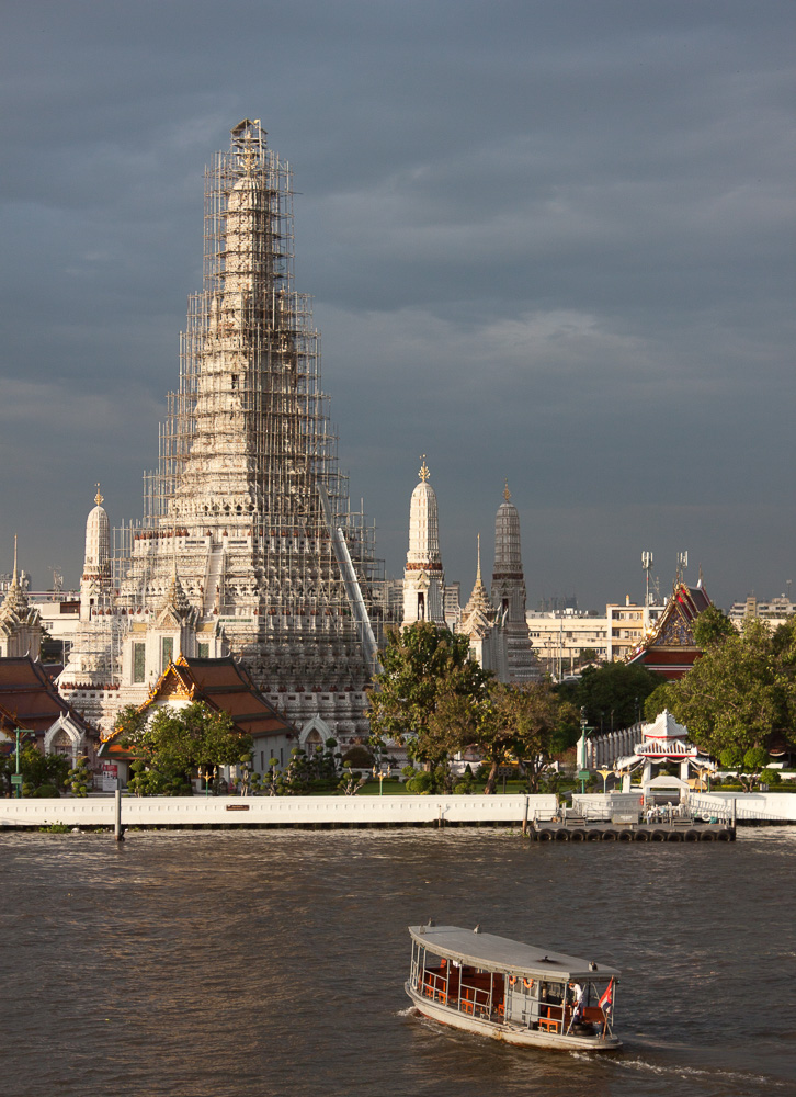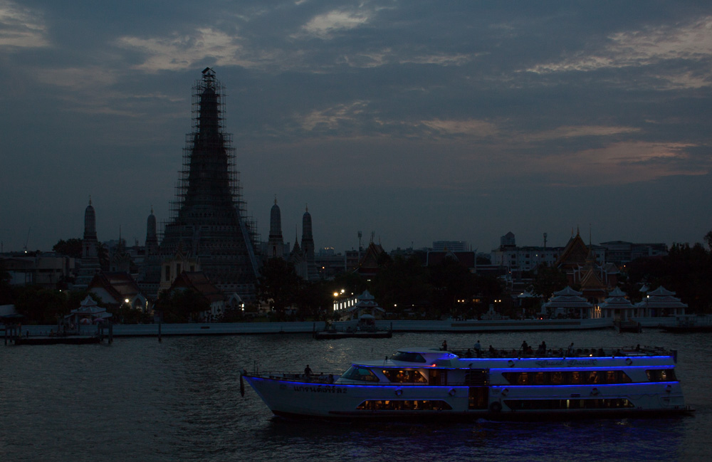 When traffic on the river is light, the scene can be quite soothing. Here is Wat Arun across the river from our hotel (Inn A Day), at sunrise and sunset.