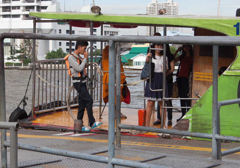 The Chao Phraya Express makes many stops along the river, like a city bus. The stops are very quick. Here is a boat coming in to dock. There is no shore crew.